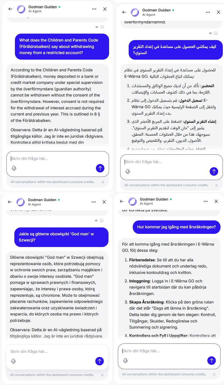 Vår AI-chatbot är utformad för att ge gode män snabb och pålitlig assistans. Den hjälper till med juridiska frågor, administrativa uppgifter och dagliga ansvarsområden, vilket gör ditt jobb enklare och effektivare. Prova den idag!